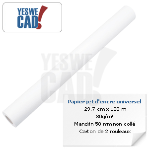 Les rouleaux de papier jet d’encre universel YESWECAD pour votre traceur jet d’encre de marques CANON, EPSON, HP, OCE et tous les traceurs jet d'encre du marché sont disponibles aux dimensions de 297 mm x 120 m avec une densité de 80 grammes.